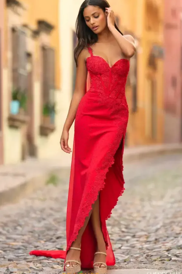 Draw the attention of all when showing up in the eye catching long style 55322 by Sherri Hill. Featuring a sweetheart neckline that is complimented with a fitted corset bodice. Along the single shoulder is a cap for dramatization. Fitted skirt detailed in glistening hot stones and finishes with a scalloped high slit.