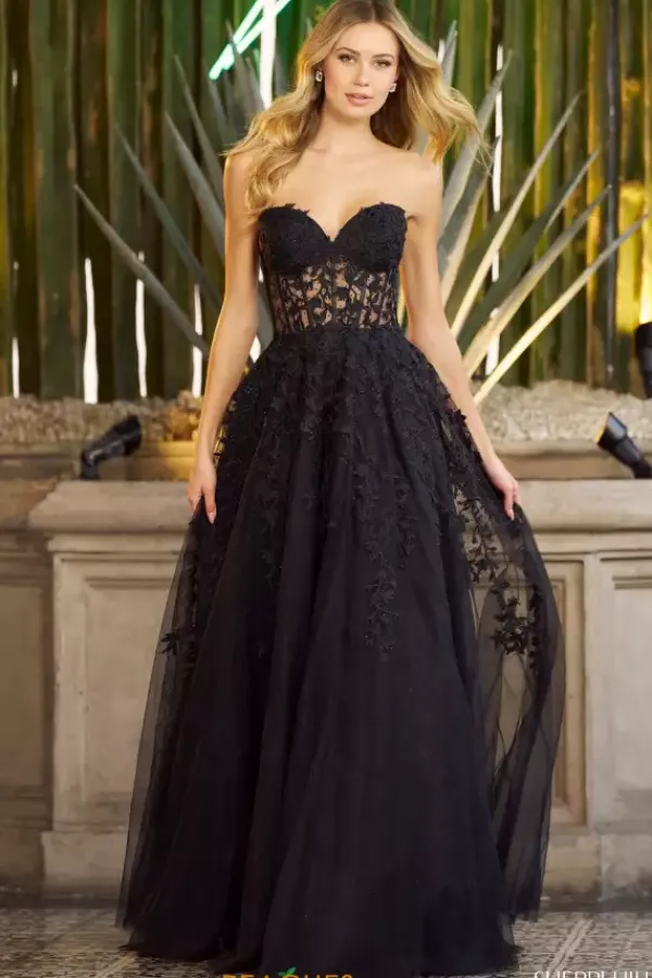 Dance the night away in fashionable long dress 55760 by Sherri Hill. The fitted bodice can be cinched and adjusted to your liking with the trendy corset lace up and stunning floral appliques are featured on the bodice and make a striking transition onto the A line skirt giving this dress a remarkable finish.