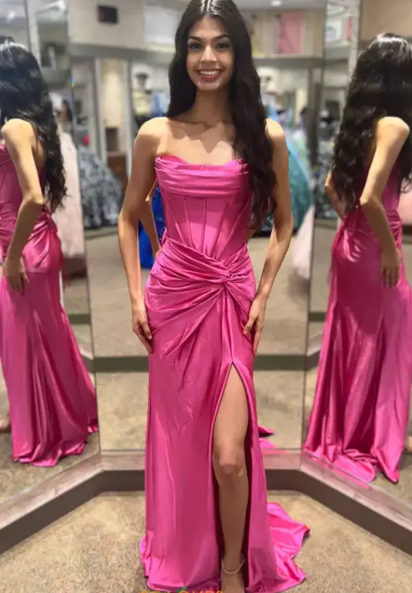 Show off your curves in sleek and classy Sherri Hill dress 55931. Made from a luxurious stretch satin fabric, this dress will accentuate your curves and flaunts a strapless draped neckline on a fitted corset bodice and a knot finish are featured at the top of the skirt complementing the thigh high slit and sweep train.