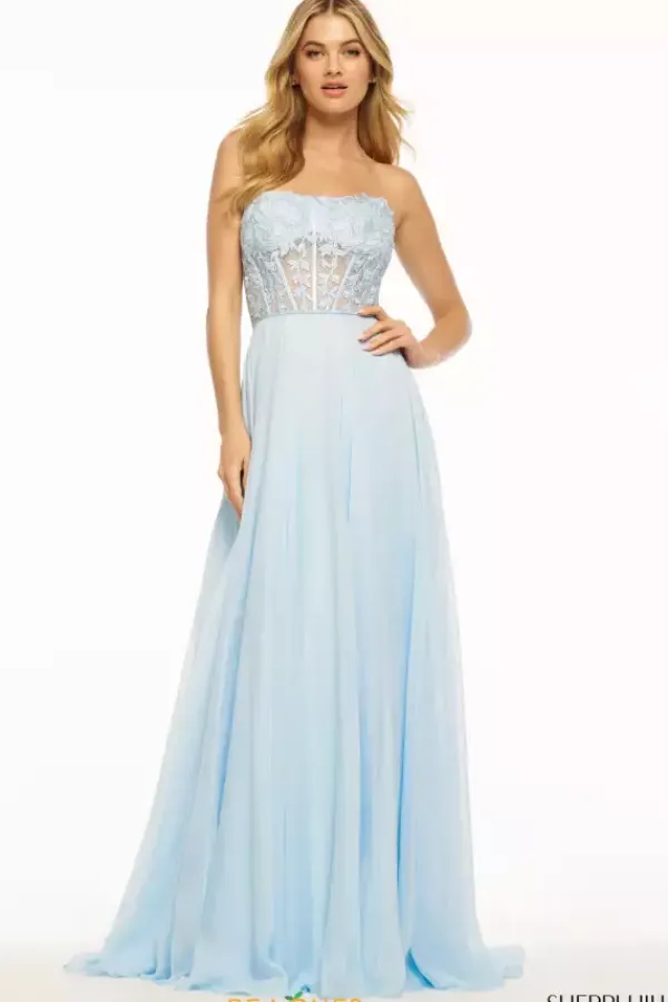 A timeless gown suitable for a wide range of special occasions. Sherri Hill fitted long style 56088 displays a graceful, sweet look featuring lovely lace applique on a strapless semi transparent bodice with visible corset boning for an extra touch of glamor. A dreamy, cascading chiffon skirt adds an ethereal effect, complete with a train.