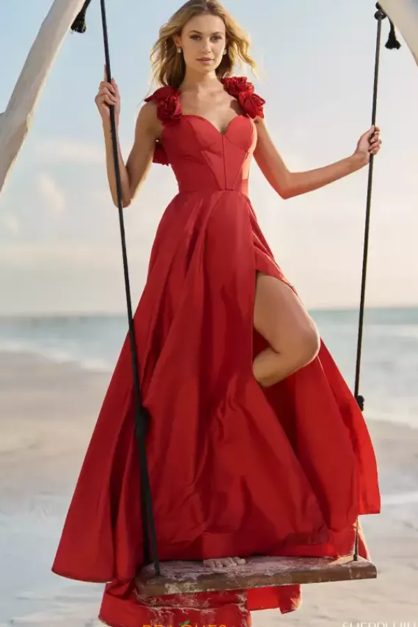 An ideal choice for your next social occasion, this sophisticated Sherri Hill dress 56123 will captivate all. Alluring, yet elegant this beautiful gown features a modest sweetheart neckline with lavish straps adorn in glamorous rose detailing. The structured corset bodice cinches at the waist defining your figure, while the lace up closure accentuates your curves. Made in an ultra chic taffeta fabric the a line skirt highlights an exquisite slit and sweep train.