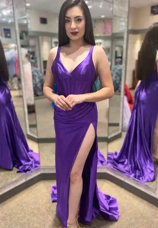 Never go out of style when you wear this sophisticated Sherri Hill long dress 56163. This ravishing stretch satin fitted dress consists of an adjustable corset bodice and V neckline while the sleek fitted skirt flaunts ruche detailing along the sides and zip up closure while a fierce high rise slit and sweep train give this dress the perfect finish.