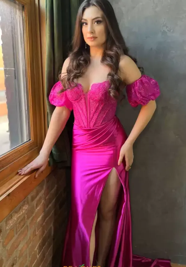 Fun and flirty Sherri Hill style 56166 features a vibrant lacey bodice with chic corset boning, glistening beading details, and a classy deep V plunge with a mesh covering. Featuring a strapless sweetheart neckline elevated with super cute puffy cap sleeves. A stunning stretch satin skirt flows elegantly, complete with a side slit and train.
