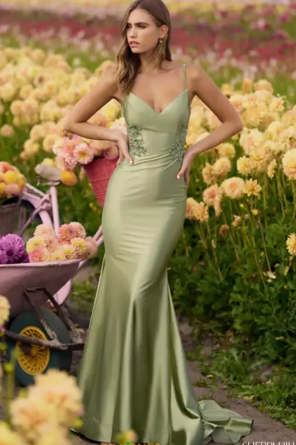 Look picture perfect at your next social in this chic body con long dress style 56315 from Sherri Hill. This sleek gown showcases a fitted bodice with a V neckline, spaghetti straps, low v back with illusion side panel adorned with embroidered lace appliques and beads. The long slim fitting skirt will show off your curves beautifully with a horsehair hem edge and sweep train.