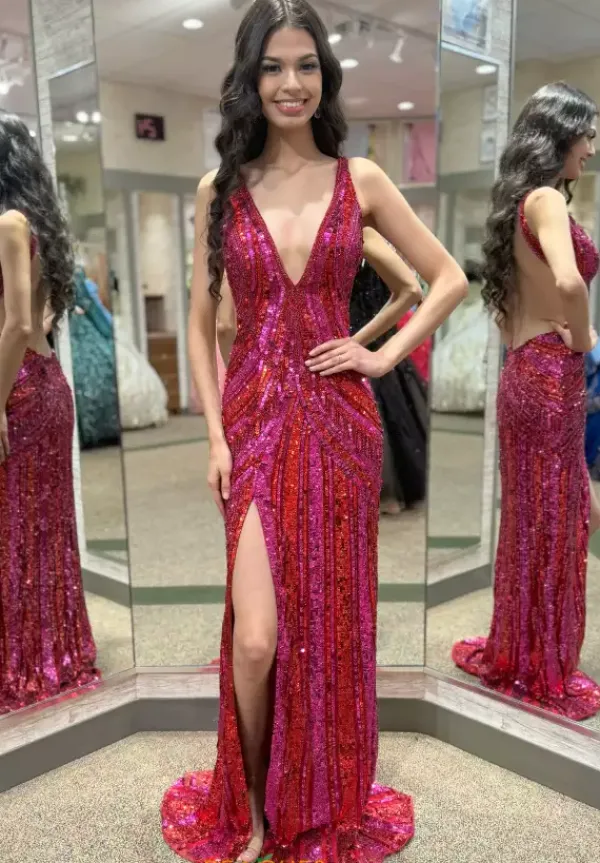 Have no competition when you step into the room wearing this perfect Sherri Hill fitted dress 56316. This fully beaded fitted dress glistens from any angles and will enhance your curves like never before. Thick straps support the V neckline and reveal a sexy open back with a zip up closure. The sweep train and slit complete this glistening Sherri Hill prom dress.
