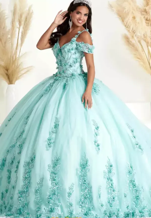 Have your fairy tale moment in this beautiful Tiffany quinceanera dress 56449. Available in soft elegant colors, this v neckline bodice showcases thick shoulder straps and off the shoulder cap sleeves. Rich three dimensional floral details add to the glam factor adorning the bodice. An adjustable lace up assures for a snug fit. The full tulle skirt then continues those details along the trim of the dress.