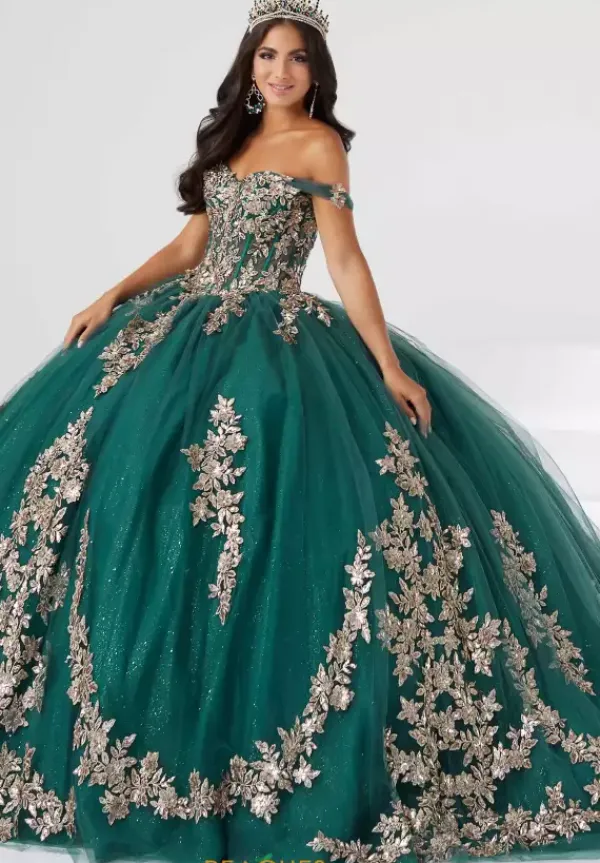Have the most memorable time in breathtaking ball gown dress 56461 by Tiffany Quinceanera. This dress is perfect and displays traditional details such as a corset bodice and voluminous tulle skirt. Sparkle from head to toe with contrasting appliques and beadwork that adorn the bodice and transition onto the glittering tulle skirt and train creating symmetrical patterns that add a striking finish. The back of the bodice features the classic lace up closure.
