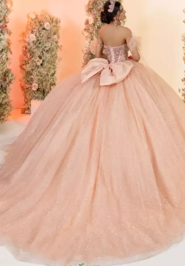 Shimmer from top to bottom when you wear this fully glistening LizLuo Quinceanera ball gown 56561. Bright beads adorn the strapless corset bodice beautifully blending with the glitter of the voluminous glitter tulle skirt, sweep train, and off the shoulder cap sleeves. A matching glitter tulle bow is featured on the back.