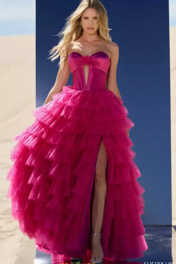 Fascinate all in sight in this extravagant Sherri Hill dress 56804. This astonishing dress features a strapless sweetheart neckline and a line silhouette. Flattering on all, the fitted corset bodice accentuates your curves, while the appealing keyhole cutout gives this style a dynamic touch. Made in a playful tulle fabric multi layer ruffles highlight the high alluring slit that makes for an exquisite exit.