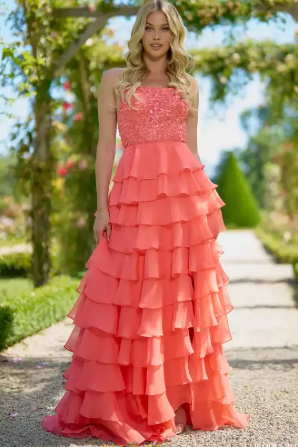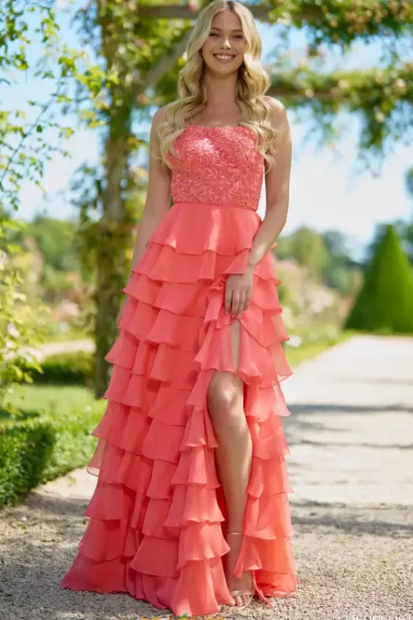 Feel classy when wearing this long a line dress by Sherri Hill, style 56866. Showcasing a scoop neckline with a sexy open corset lace up back that will hug your body beautifully all night long. The top is adorned with floral lace applique and glistening beadwork. The bottom is made out of chiffon ruffle material. For the perfect final touch it has a high thigh slit and a sweep train.