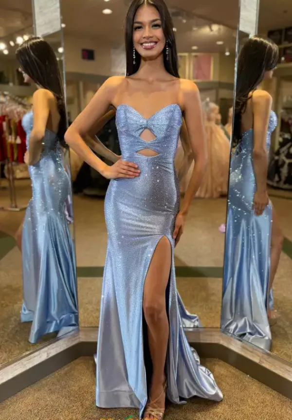 Wear this fun and flirty Sherri Hill dress at your special event. This striking fitted style 56932 showcases a lovely sweetheart strapless neckline that is being help in perfectly by the eye catching lace up open back. Completely adorn with trendy beadwork and a thigh high slit, this dress will have all eyes on you.