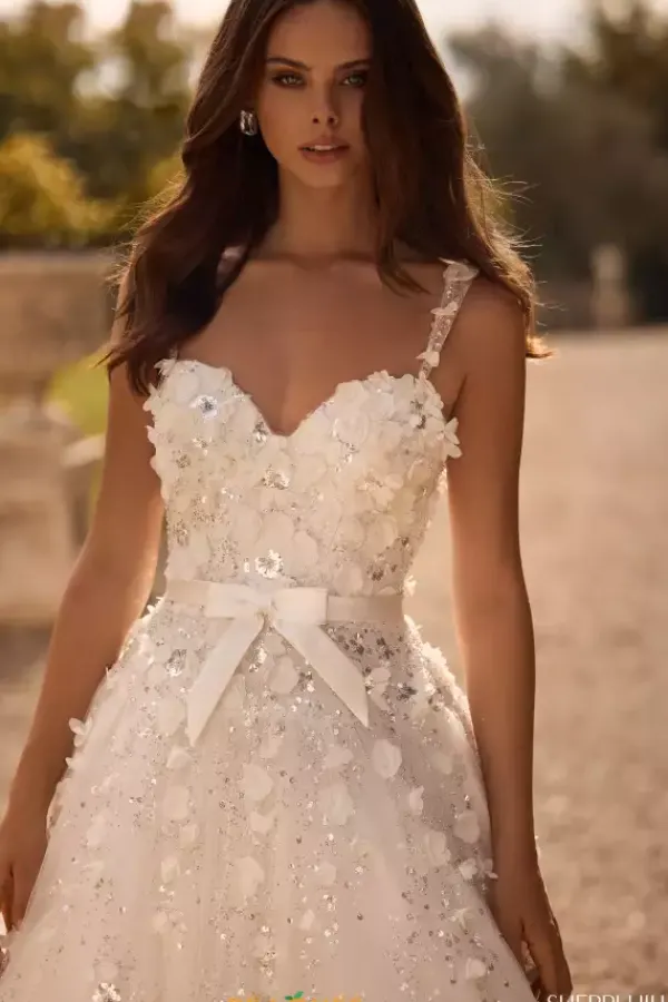 Feel like you just stepped out of a fairy tale and into your prom in this Sherri Hill a line dress 57070. The fitted sweetheart neckline bodice is adorn with three dimensional flowers combined with rhinestone beading. The waistline is belted with a bow and flowing tulle covered in those three dimensional flowers continue down the skirt.