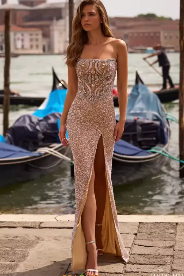 Be adorned in ravishing combinations of beads and sequins when you wear this fitted pageant style 57611 designed by Sherri Hill. Symmetrically sewn silver and nude beads shimmer throughout the strapless bodice while the fitted slit skirt is garnished in radiant sequins that exude an everlasting sparkle.