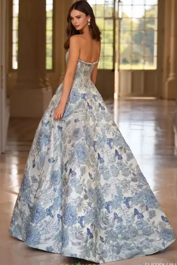 Exude elegance and grace at prom in this indulgent Sherri Hill long dress style 57741 made in a rich floral print brocade fabric trimmed with sparkling pearls. This impeccable gown showcases a strapless, structured corset with a scoop neckline and low zipper closure back. The long, full, a line skirt flows beautifully to the floor with a sweep train.