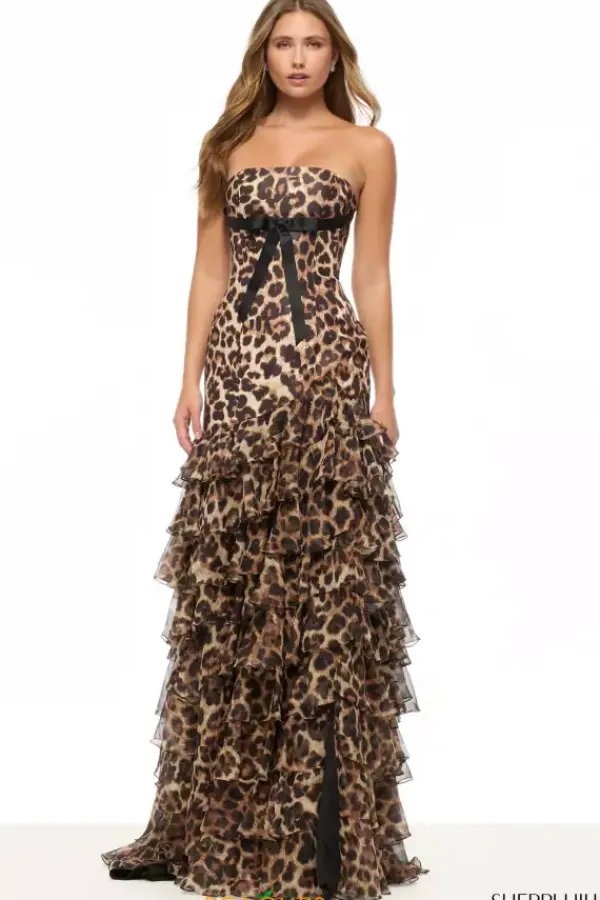 Channel your inner fashionista for prom and wear this impeccable Sherri Hill long dress style 57825 made in fun animal print fabric. This on trend gown features a taffeta fitted bodice with a strapless neckline with black ribbon bow detailing under the bust. The long, straight skirt has chiffon, ruffle, tier layers with a small back train.