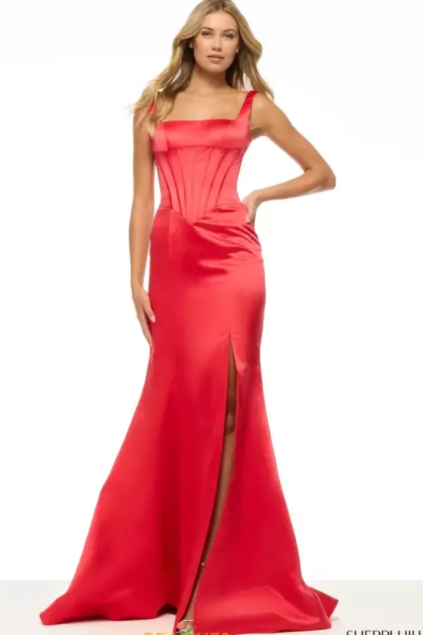 Less is way more when wearing Sherri Hill long dress 54840. This sleek and simple silhouette showcases a modest scoop neckline with thick shoulder straps paired with an accentuating lace up open back and corset bodice. The shiny satin material features a must have thigh high slit and graceful sweep train.