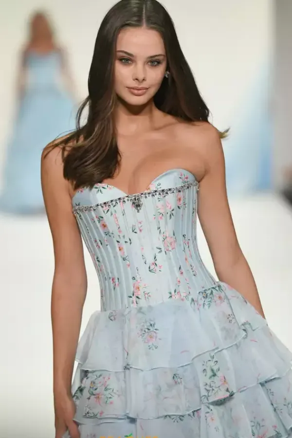 If you are looking for pastels and floral prints, then this unforgettable Sherri Hill dress 57913 is for you! The strapless sweetheart neckline is met with a straight row of silver dainty beadwork on an elongated ultra boned corset bodice that cinches the small of your waist as the popular layered chiffon skirt flares out.