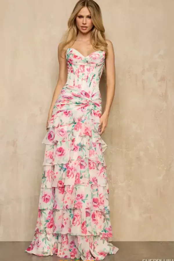 Make the crowd fall in love with this charming ivory red print a-line prom dress style 57972. The zip up corset bodice displays a trendy strapless sweetheart neckline while a knot embellishment exudes elegant ruching across your hips. The flowy multi tiered closed skirt is completed with a timeless sweep train.