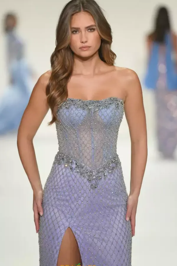 Be the envy of all with this must have Sherri Hill pageant dress 67128. Silver ultra shiny beadwork traces the strapless sweetheart neckline and the v shaped seam of the sheer illusion corset bodice. Beaded net patterns adorn the entirety of the dress ending at the hem of the long skirt where the wide slit is displayed.