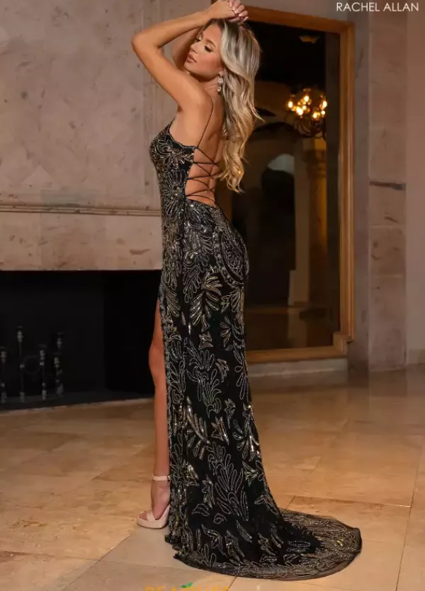 Step into vintage-inspired elegance with the Rachel Allan 70002 gown. This picture-perfect prom dress showcases an intricate pattern of vibrant colored sequins and beading that will ensure all eyes are on you throughout the evening.