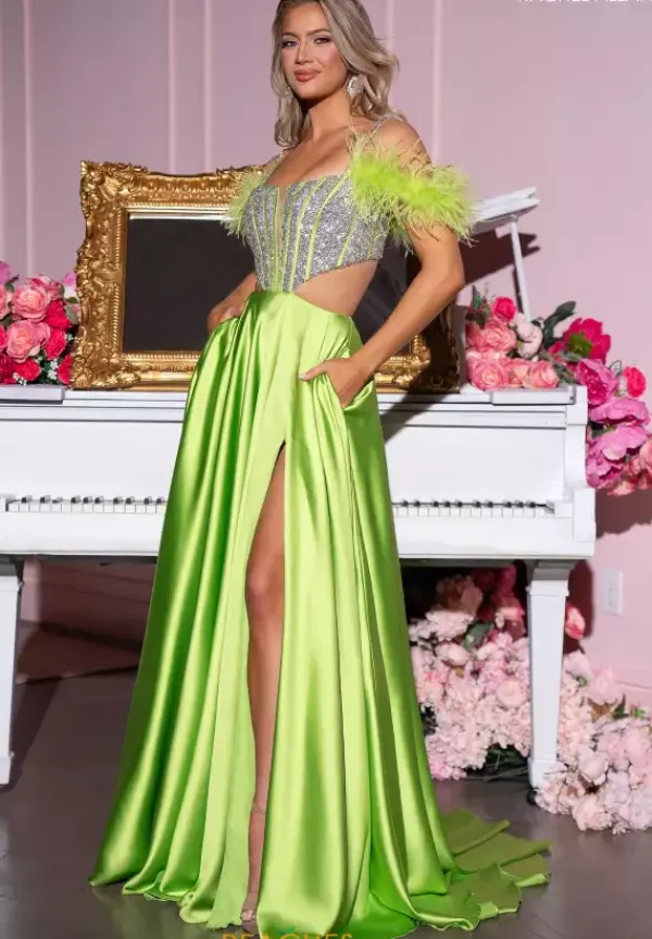 Show off your chic sense of style in ornate Rachel Allen style 70519, displaying a gorgeous fitted bodice adorned in glistening beading and featuring flattering side cut outs. Corset boning amplifies the plunge mesh covered neckline. Feather cap sleeves add a glamorous touch, complimenting the beaded straps. An lush satin A Line skirt perfectly finishes this look, flowing elegantly.