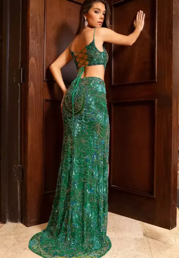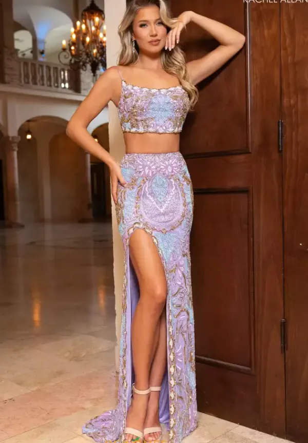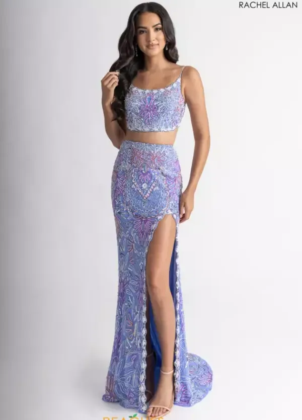 Make them stop and stare when wearing this long fitted two- piece dress by Rachel Allan, style 70794. Showcasing a scoop neckline with delicate straps leading to a open corset lace up back. Featuring a fitted skirt that’s made out of stretchy lining material. Fully embellished with unique dazzling beadwork patterns and designs throughout the ensemble. For the perfect final touch it has an outstanding slit and a marvelous train.