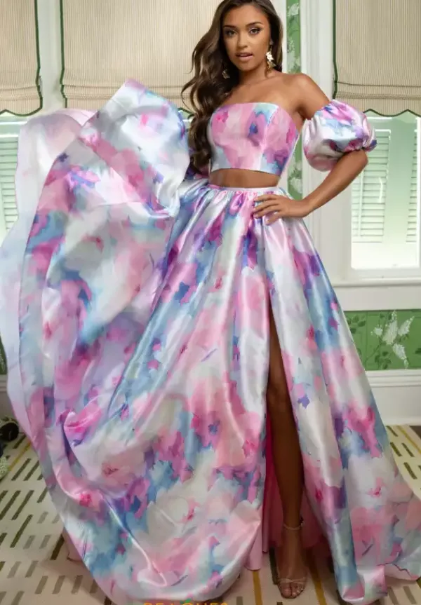 Show off your unique side when wearing this long A line two piece dress by Rachel Allan, style 70921. This show stopping mikado dress features a stunning strapless top paired with gorgeous off the shoulder cap sleeves. Finish off this look with a must have slit. The gorgeous design on this gown ensures you stand out.