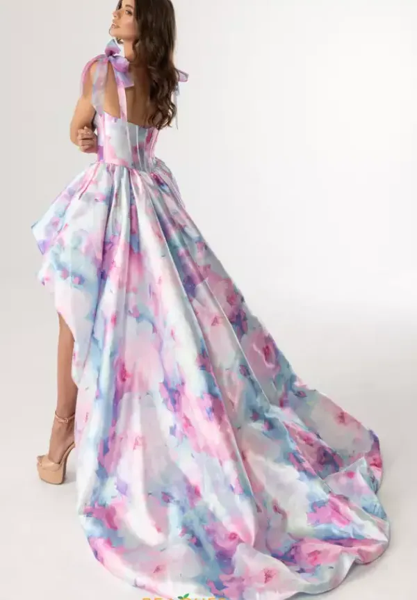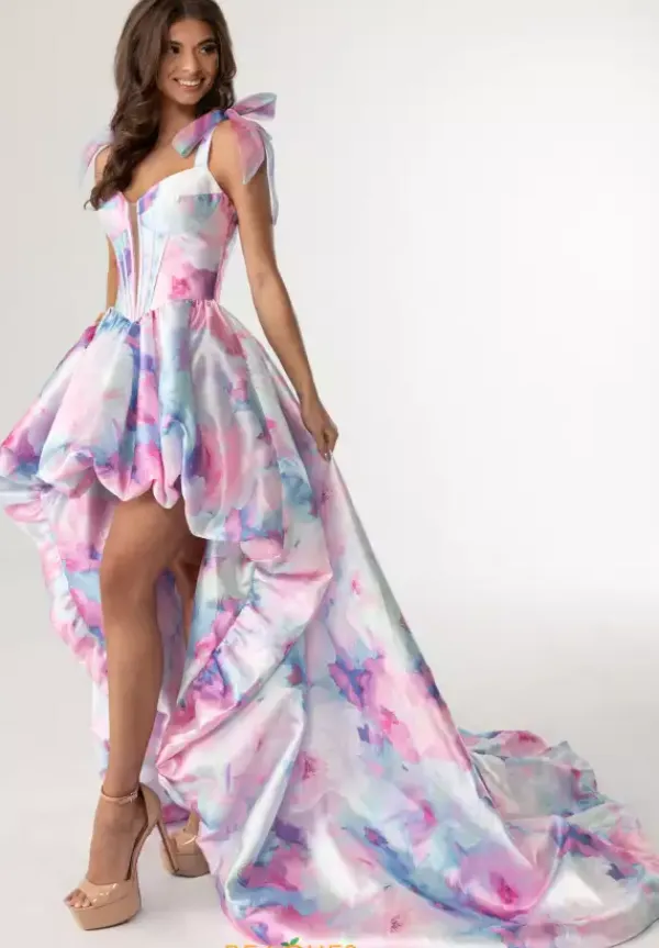 Your vibe will be immaculate in this fun and youthful Rachel Allan high low dress style 70960. This thrilling pink multi shade flaunts a white base with a pink and blue tie dye effect to amp up the excitement. The lavish bubble hem of the high low skirt adds the perfect finishing touch with the plunged bodice.