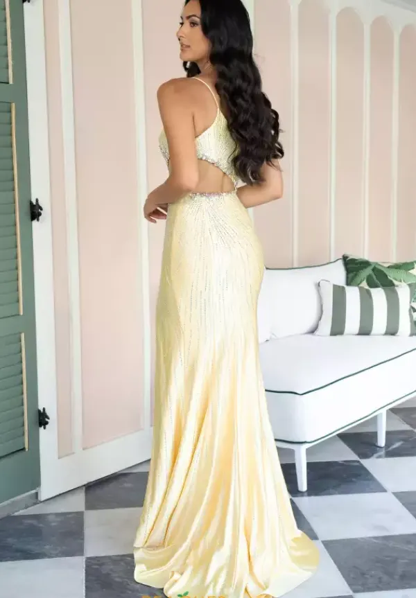 Be the most fascinating in this bright and flattering Rachel Allan prom dress style 70965. This sexy fitted style displays an asymmetrical single shoulder neckline along with a dramatic midriff cutout that accentuates a single side of your waist for a flattering effect. Glimmering beads trace the outline of the cutout and scatter into sparkling rows throughout the dress.