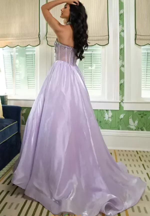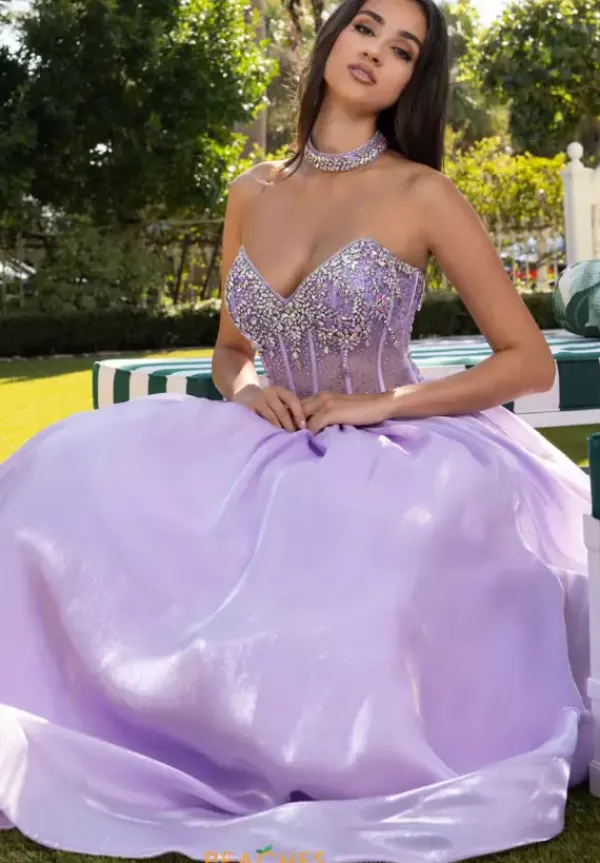 Look like a goddess in this enchanting organza ball gown style 70998 designed by Rachel Allan. This luminous gown displays reflective stone beadwork across the strapless v neckline of the sheer mesh corset bodice. The glowy organza closed skirt is completed with an unforgettable lengthy sweep train.