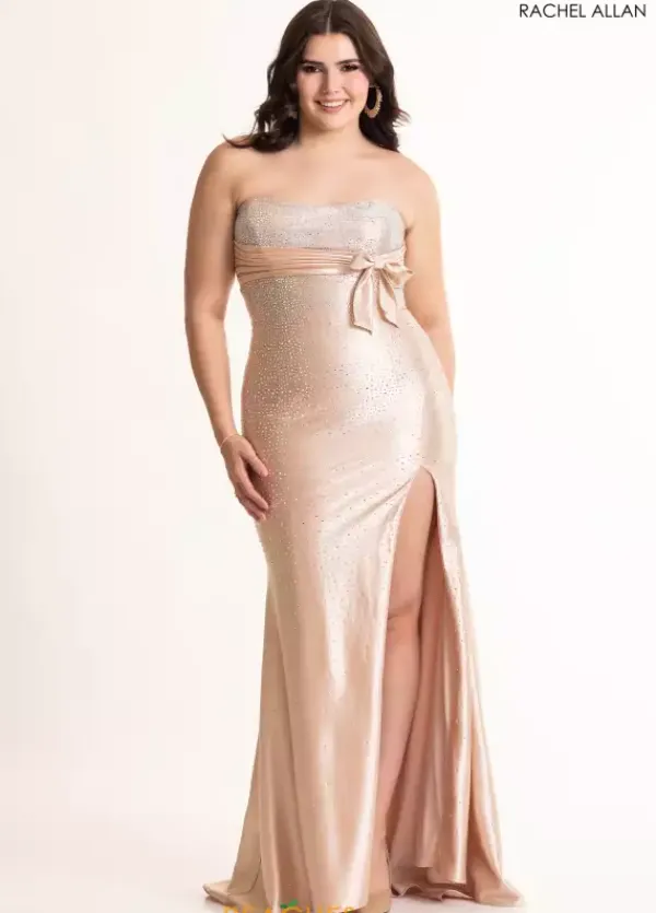 Show off your figure in this sleek fitted Rachel Allan long dress 71067. The strapless scoop neckline is met with an empire ruched belt with a bow. The dress is sparkling head to toe in hot set rhinestone beading and the skirt has a front thigh high slit and sweeping train. The stretch satin material hugs to your frame.