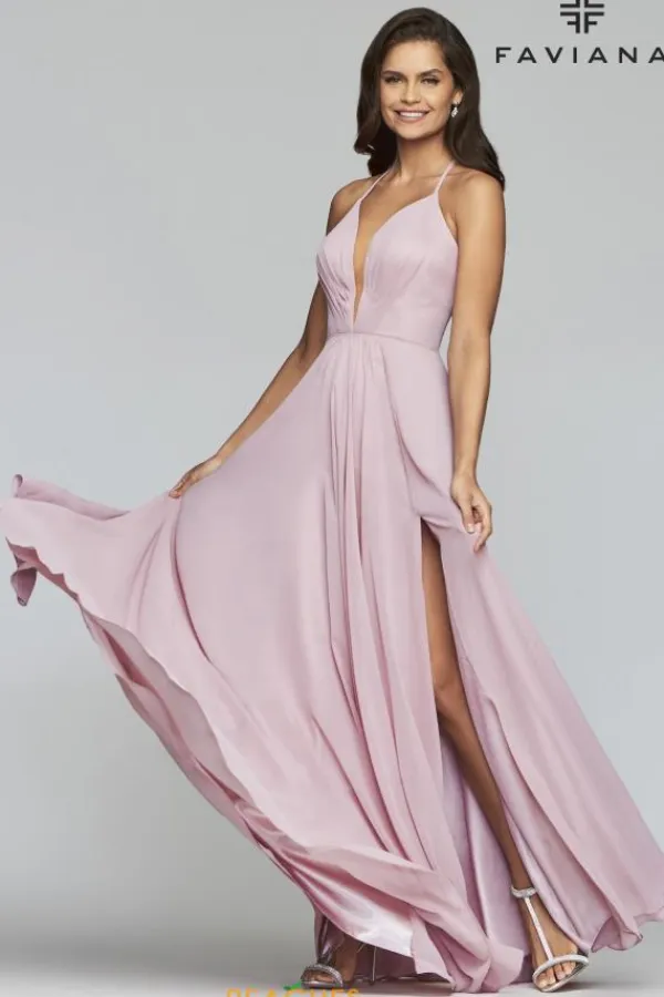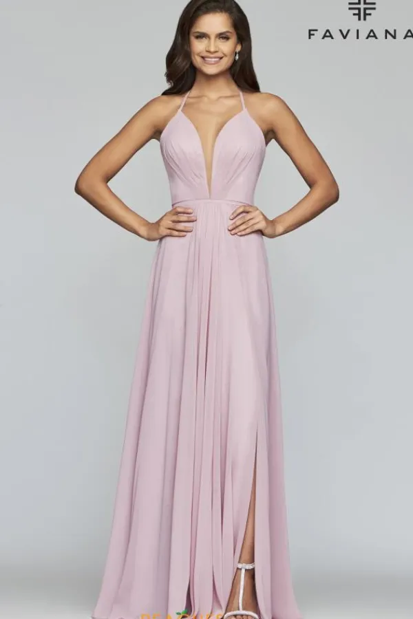 With a plunging neckline and flowing chiffon skirt you are sure to turn heads in this Faviana prom dress 7747. Thin spaghetti straps make a halter neckline that creates a unique modified lace up corset while the flowing chiffon skirt shows a thigh high slit. See more stunning Faviana dresses at Peaches Boutique today.