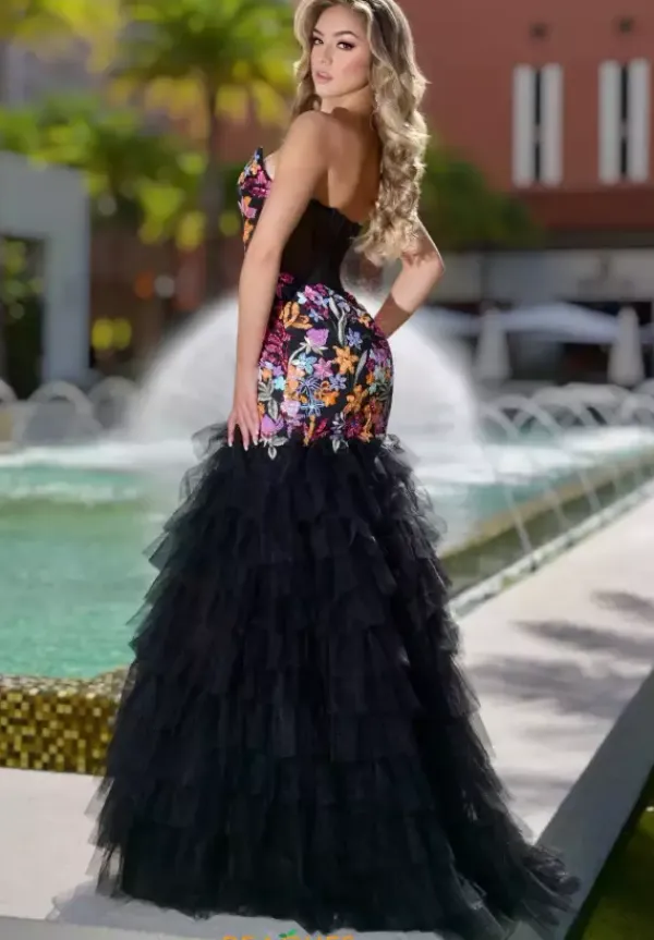 Be one of a kind in this gorgeous Jasz Couture prom dress style 7901. Available only in this black and multi color way, this strapless sweetheart neckline bodice showcases a long drop waist with sheer illusion side panels. The multi colors sequins embroidered appliques adorn the bodice and fitted skirt until it flares out to give you a mermaid look.