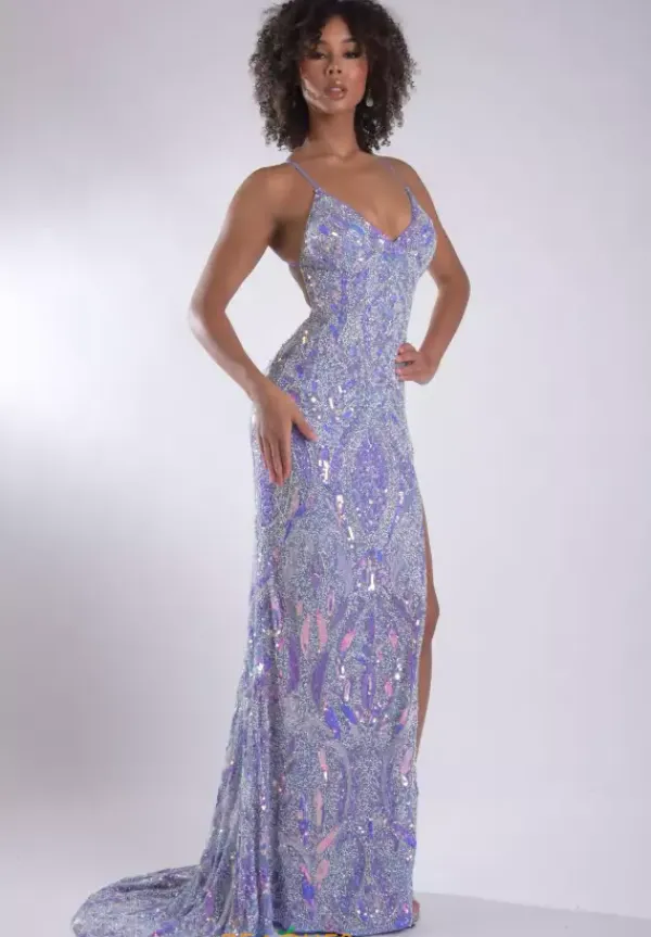 Love your curves in this sophisticated Jasz Couture prom dress style 7951. This fitted curve gripping sweep length dress is adorned in radiant ornate sequin beaded patterns that will not go unnoticed. The V neckline is supported by dainty crisscross straps above the trendy open back. The classic thigh high slit is the perfect finishing touch.