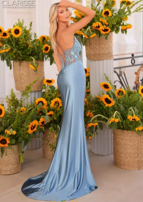 Look elegant and chic at the same time when wearing this gorgeous Clarisse dress 810708. Featuring a scoop neckline this lavish fitted dress is complemented by a corset bodice thats adorned with stunning applique. Ravishing fitted skirt is made out of jersey material and is accompanied by a lovely sweep train and thigh high slit.
