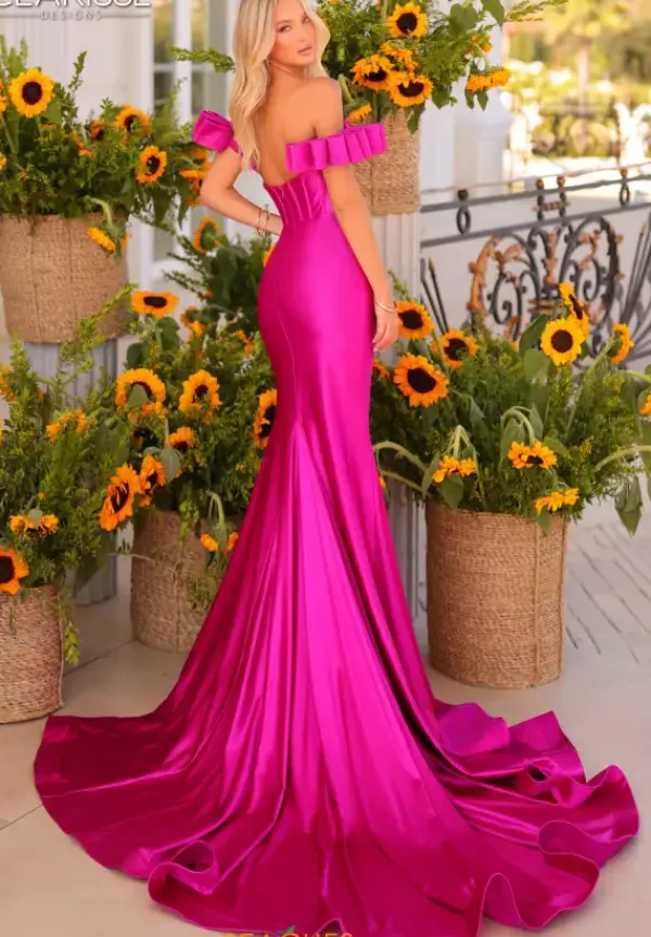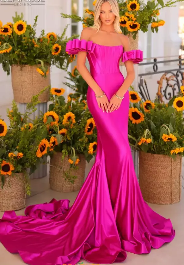 Feel like you just stepped off the red carpet when wearing this glamorous long dress from Clarisse style 811160. Featuring a strapless scoop neckline with a one of a kind detachable off shoulder sleeves and a corset bodice. This dress is made out of a soft jersey material and adding to this number is the long train.