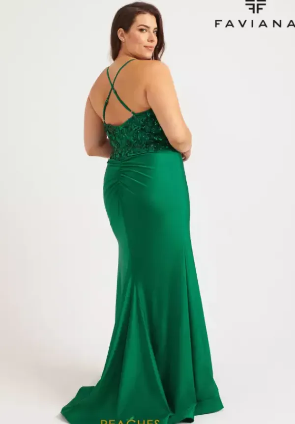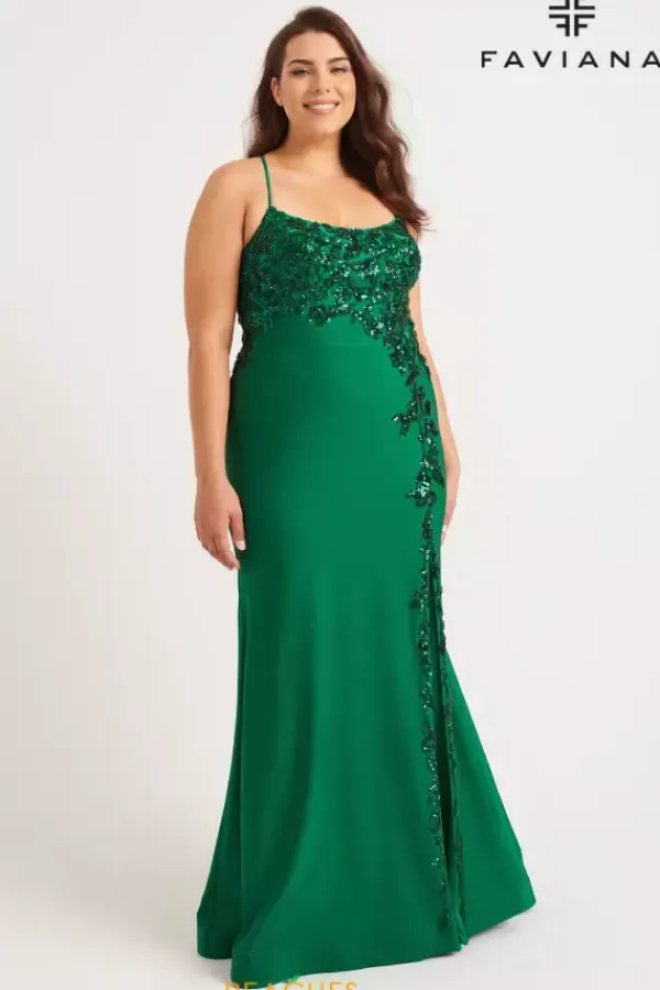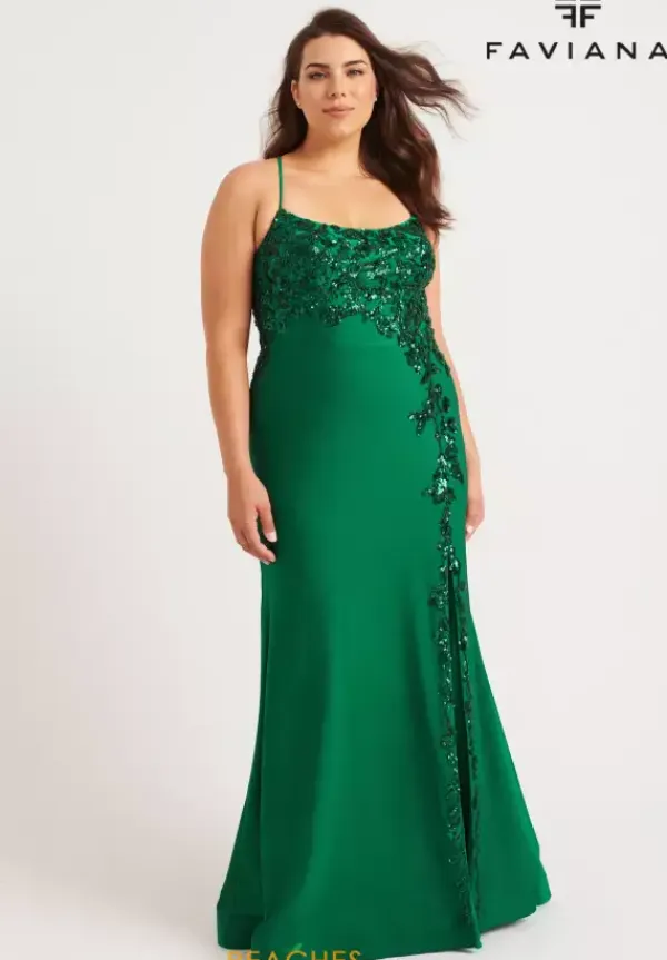 Elegant yet simple is the way to go to your next special event when you wear this long fitted dress by Faviana style 9570. This number has a gorgeous scoop neckline that follows to criss cross straps on the back. Beautiful beadwork going down the bodice’s skirt with lovely sequins. A front slit to give that final perfect touch.