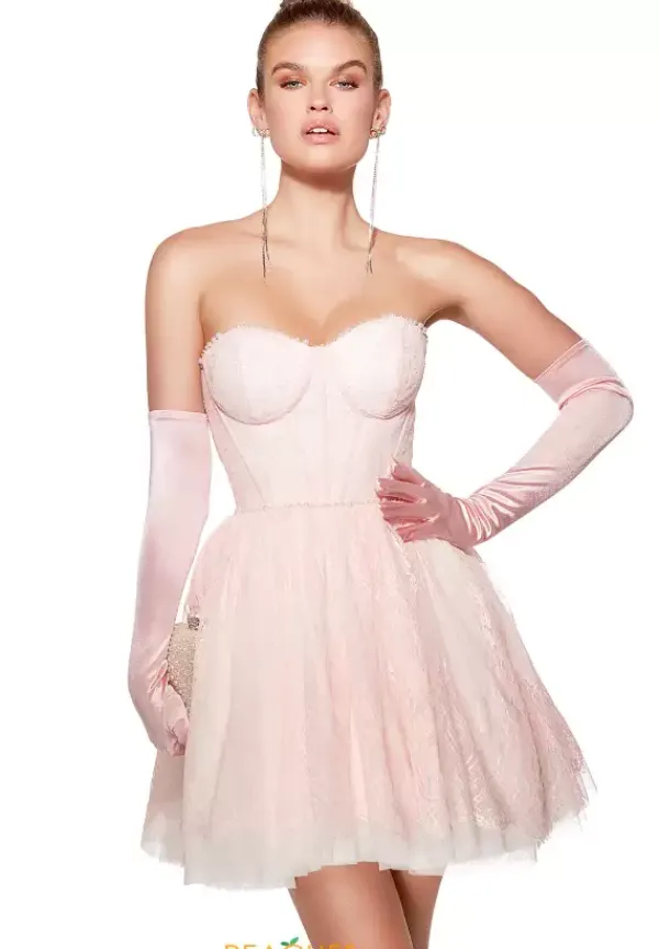 Leave them speechless when you enter the room wearing this romantic short A line dress by Alyce Paris, style 30041. This dress like no other features a strapless sweetheart neckline with a cinching corset. The voluminous skirt flows beautifully with your every move. Made in lace material you will for sure have eyes on you all night.