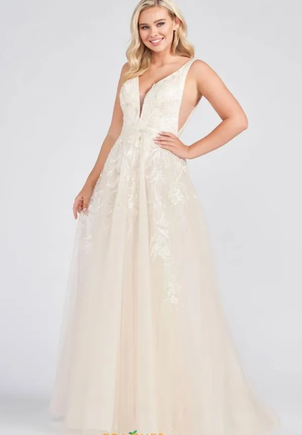Made in soft pastel colors, this gorgeous Ellie Wilde long dress EW122081 is the perfect choice for your senior prom. has a low v neckline and full a line silhouette. The fitted bodice showcases a plunging neckline and side mesh illusion insets to flatter your figure. The aline silhouette is adorned with beautiful lace embroidery.