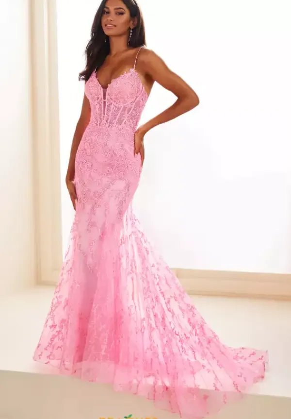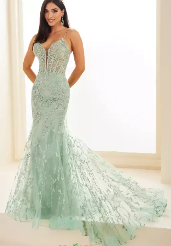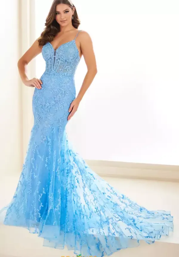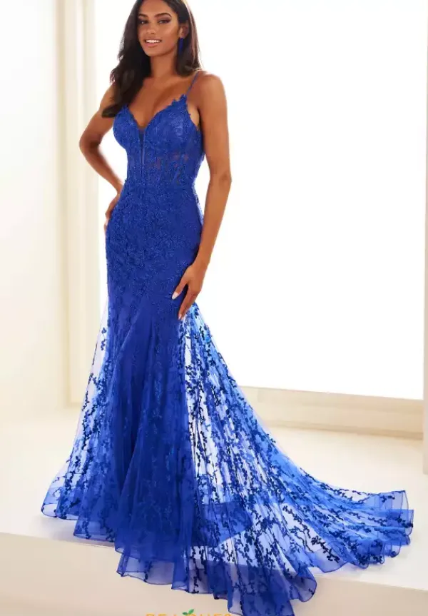 Make a stunning entrance at your upcoming event in this beautiful long gown by Ellie Wilde 35010. Showcasing a classy deep v cut neckline with a mesh insert and two supportive thin straps. The fit and flare silhouette will hug your curves and show off your hourglass figure. Adorned entirely in a glitter embroidery for the perfect amount of drama.
