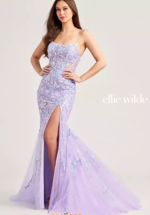 Straight off the runway this dashing Ellie Wilde gown EW35057 will magnetize all in sight. Astonishing and fabulous, this gorgeous gown features a modest scoop neckline and dainty thin straps. The sheer corset bodice highlights your curves, while the lace up closure accentuates your figure. Shimmering floral appliques adorn the entire gown illustrating an elaborate embroidery. Create an unforgettable impression in this fitted silhouette that highlights a high appealing slit and elegant sweep train.
