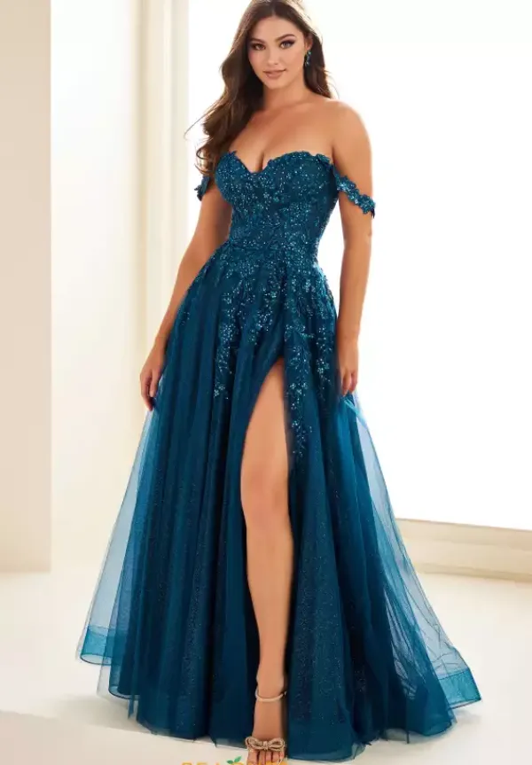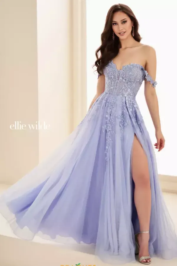 Look as ethereal as ever in this enchanting Ellie Wilde A-line dress EW35101. Glistening from top to bottom, This flattering A-line features dazzling floral appliques throughout the entire fitted corset bodice and glittering tulle skirt that features a timeless slit paired with a classic sweep train.