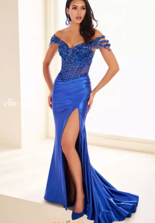 Show off your elegance when you wear this royal long fitted dress by Ellie Wilde style EW37056. This bodice features a fabulous strapless v neckline with detachable off- the- shoulder straps that are dazzled in dazzling beadwork. The corset is fully detailed in applique and stunning sequins. Made in stretch knit material, the high thigh slit is perfect for pictures.