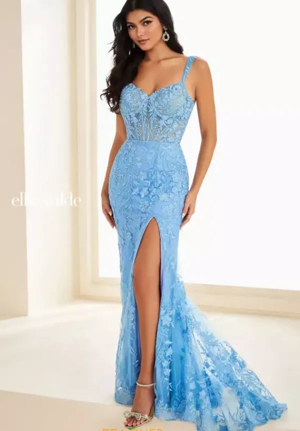 Exude timeless elegance in this stunning dress by Ellie Wilde, style number EW37224. Featuring thick straps and a classic sweetheart neckline, the bodice showcases a sheer corset adorned with delicate applique. The full length skirt continues the intricate detailing and is complemented by a mid length slit for a graceful yet modern touch
