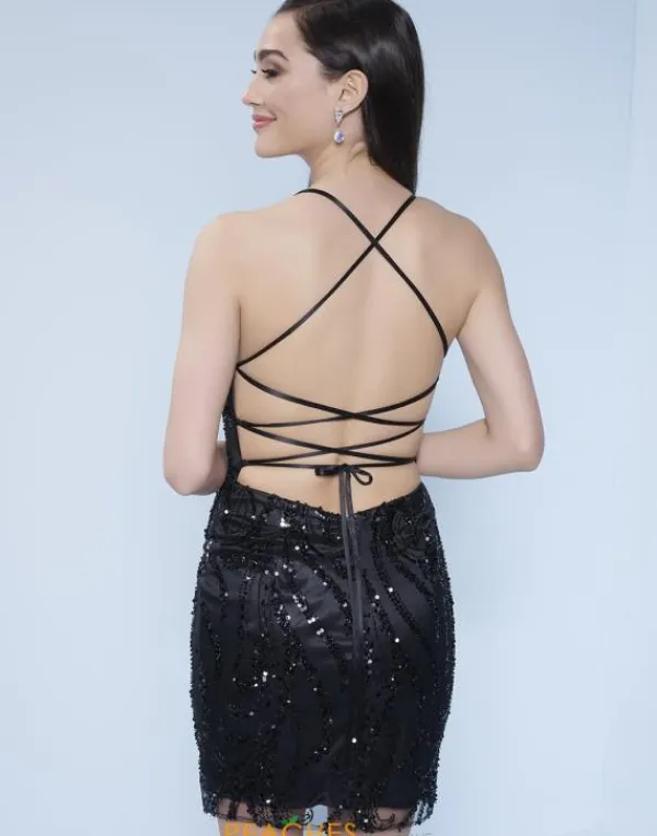 This elegant cocktail dress F359 by Splash is a perfect choice for any special occasion. Style F359 showcases a deep v neckline with a mesh inset and a slim fitting silhouette. Glistening sequins adorn the entirety of this number in an intricate detailing. The back of this dress displays a lace up corset closure.