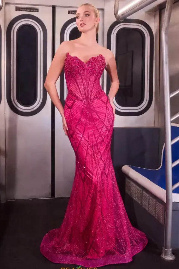 Shimmer and sparkle from all angles when you show up in this striking La Divine by Cinderella long fitted dress style J888. The strapless v neckline long waisted bodice is made from a sheer illusion material. Exposed boning detail and sparkling appliques adorn the bodice as well. The glitter tulle skirt adds to the glam factor.