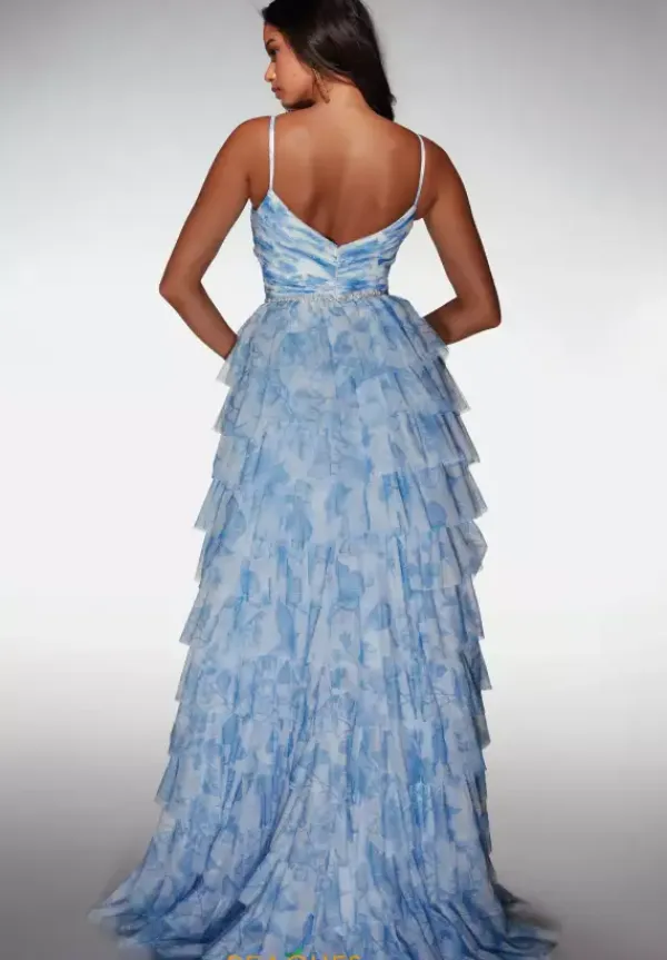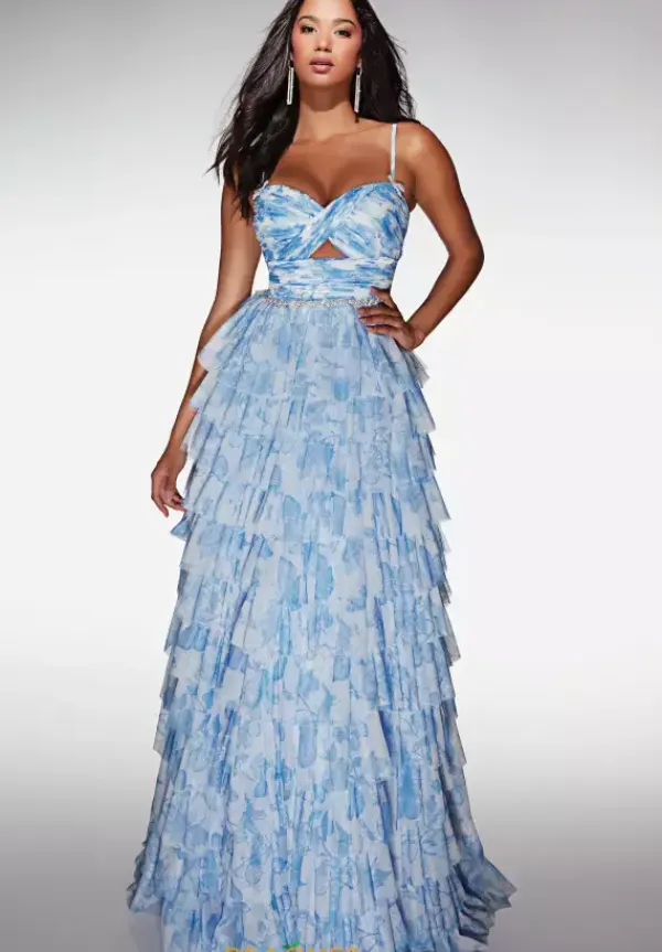 Turn heads at prom in this eye catching Alcye Paris long dress style 62018 made in printed soft mesh shades. The phenomenal dress features a fitted bodice with front cut out with a sweetheart neckline, spaghetti straps, pearl beaded waist embellishments and low back. The long a line skirt has ruffle tier layers for fullness and a back sweep train.