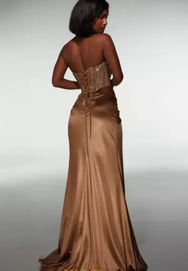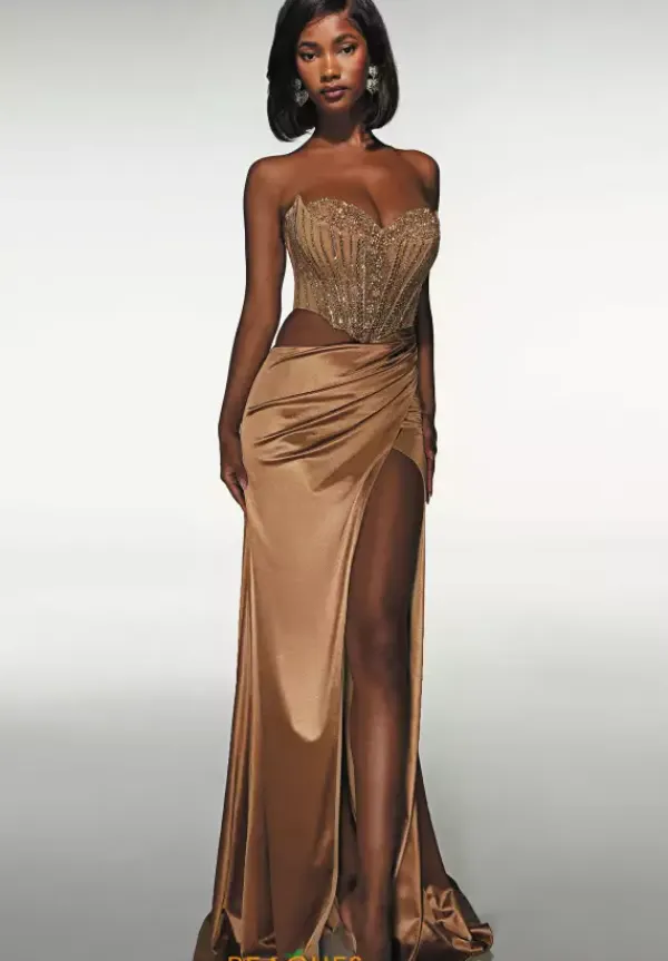 Look like a celebrity in this intriguing fully glistening Alyce Paris floor length prom dress style 62087. Shimmering glitter and dainty beads glisten throughout the fitted corset bodice while subtle pleating asymmetrically tavels down the front of the silky satin thigh high slit skirt. A midriff cutout is featured on a single side of your waist for a flattering effect.
