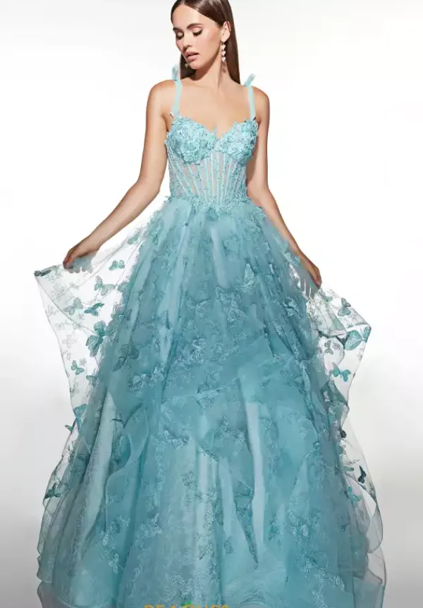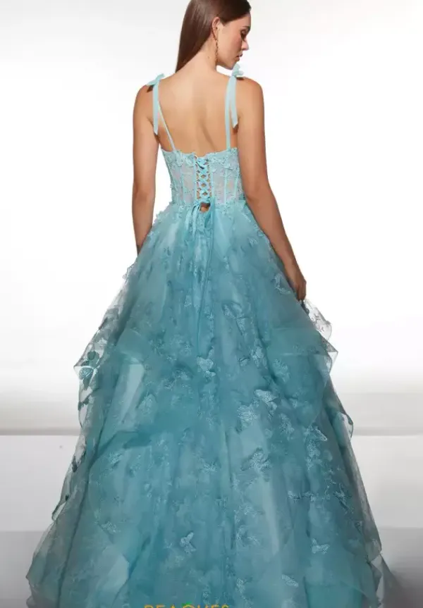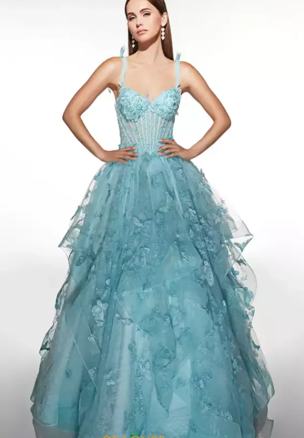 Show off your inner princess in this gorgeous Alyce Paris prom dress style 62199. The ball gown style dress features a sheer illusion bodice with a sweetheart neckline with tulle shoulder straps complements with bows on top. The bodice is adorn in lace and butterfly appliques. The swirls tulle skirt continues those details and is only available in this baby blue color.
