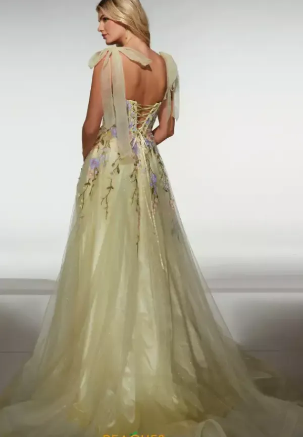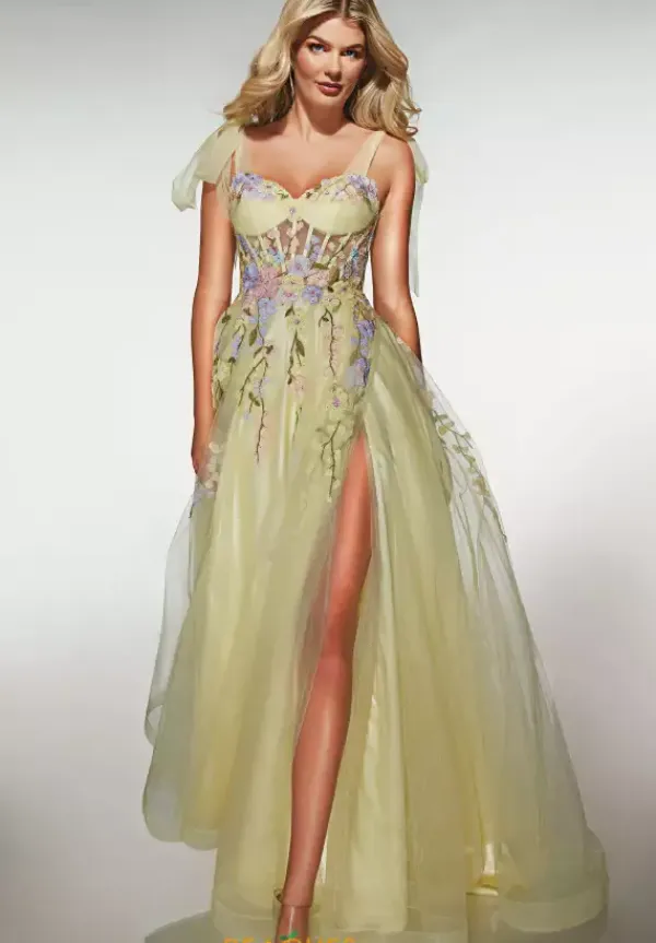 Have your fairy tale moment wearing long extravagant A line dress by Alyce Paris, style 62204. Featuring a charming sweetheart neckline with tulle cap sleeves paired with a lace up back. The sheer corset bodice is adorned with a blend of floral applique, lace, and beadwork that cascade into the long tulle train that features a slit.